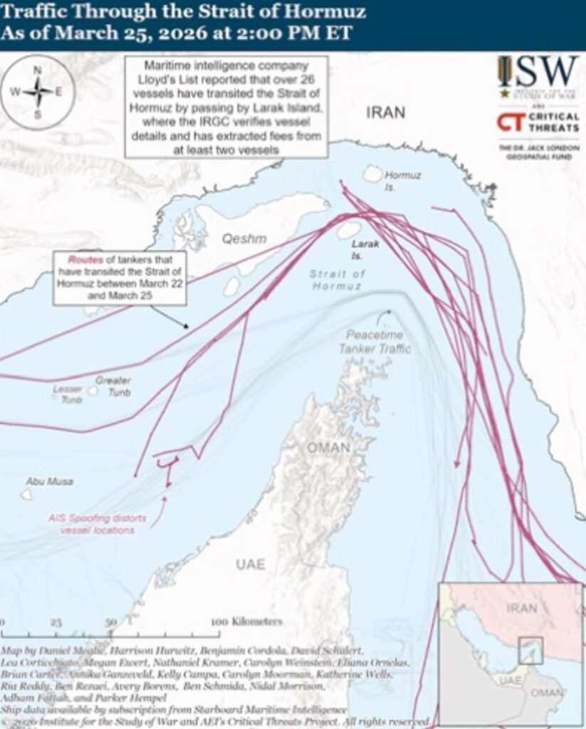 La mappa (ISW/CTP via Critical Threats) mostra rotte di petroliere transitate tra 22–25 marzo e l’evidenza di corridoi “verificati”; segnala anche che lo spoofing AIS può distorcere le posizioni.