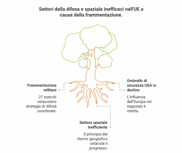 Nel comparto della difesa e dello spazio, Draghi ha definito la situazione allarmante: l’Europa conta 1,4 milioni di militari suddivisi in 27 eserciti nazionali, senza comando unificato né strategie comuni. La deterrenza è affidata agli Stati Uniti, la cui protezione non è più garantita. In ambito spaziale, il principio del “ritorno geografico” ostacola l’efficienza e la competitività.