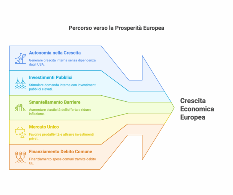 Per superare questi limiti, Draghi propone un nuovo quadro macroeconomico. L’Europa, afferma, deve smettere di affidarsi alla domanda esterna – soprattutto quella americana – e generare crescita internamente. Serve un piano integrato: maggiori investimenti pubblici, abbattimento delle barriere interne, e sviluppo del mercato unico.