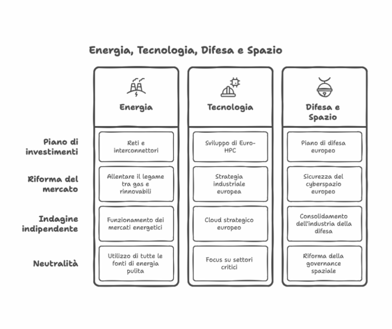 Sul fronte tecnologico, suggerisce una strategia industriale europea che concentri le risorse su nodi critici (cloud, HPC, cybersecurity, reti 5G/6G) e preveda un “cloud europeo strategico” per la sovranità digitale. Il superamento della frammentazione e una regolazione più favorevole all’innovazione sono condizioni essenziali.