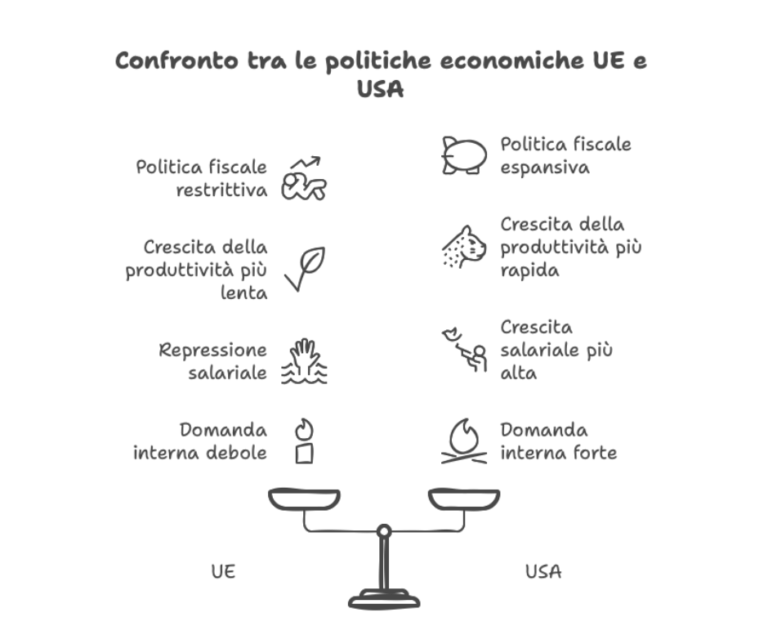 L’UE, nel tentativo di uscire dalla crisi del debito, ha adottato una politica fiscale restrittiva, con saldi strutturali positivi (+0,3% del PIL in media), a fronte del forte stimolo americano (-3,9%). Il principale sacrificato è stato l’investimento pubblico, rimasto depresso fino alla pandemia. Contestualmente, si è puntato sulla competitività esterna comprimendo salari reali, senza incentivare la produttività interna, che è cresciuta la metà rispetto a quella americana. Il risultato è un divario cumulativo del 27% dal 2000.